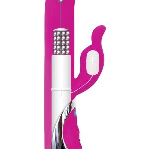 Ten duży, wspaniały królik jest równie potężny, co wszechstronny! Wykonany z jedwabistego, gładkiego, luksusowego silikonu, jego elementy sterujące oferują oddzielne przyciski dla każdej funkcji, w tym obracania kierunku, funkcji wału i wibracji uszu królika! Obrotowe koraliki w trzonku gwarantują płynną jazdę za każdym razem, a oświetlenie LED i chromowane wykończenie sprawią, że możesz spełniać swoje marzenia w wielkim stylu! Łatwe czyszczenie za pomocą środka do czyszczenia zabawek i spłukiwania ciepłą wodą.