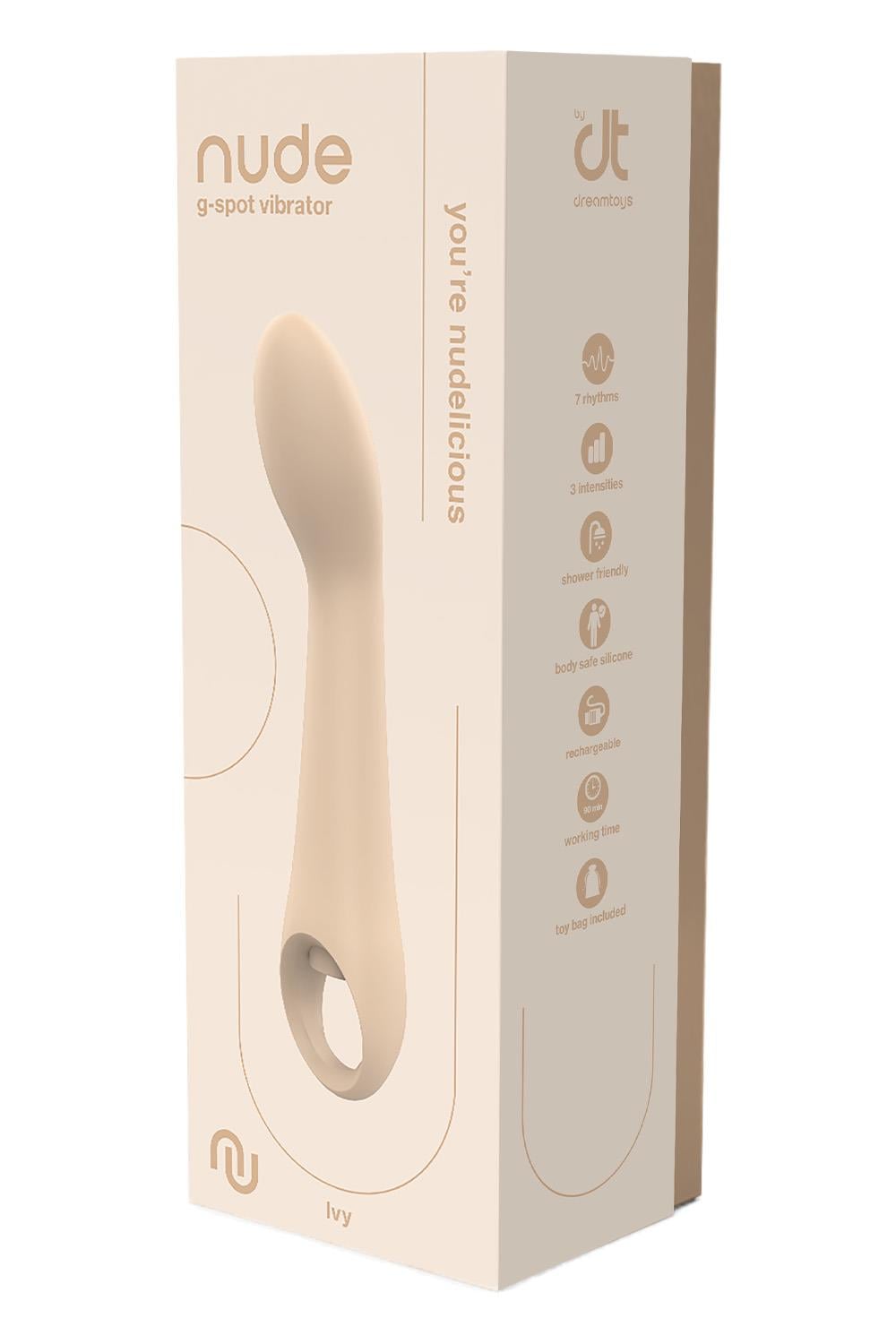 At Nude, we believe in the power of purity and quality. That’s why each and every one of our products is meticulously crafted to provide you with an experience that’s as natural as it gets. Say goodbye to anything less than extraordinary and unlock the true essence of pleasure with our clean and refined toys. Experience the pleasure revolution that’s sweeping the world – the Nude revolution. Our products are more than just toys they’re gateways to euphoria and liberation. Let’s get naked and unleash your most audacious fantasies with Nude’s premium range of sensual delights. It’s time to redefine pleasure, the Nude way.This Nude G-spot vibrator Ivy is easy to use thanks to the single button to cycle through the 10 strong vibrations. It has 7 rhythms and 3 speeds. This Nude vibe is made of smooth soft silicone and ABS, free of phthalates and body safe. Ivy has an IPX6 rating for water resistance. For charging after use the vibrator has a waterproof charging hole. A USB pin cable is included. After a full charge your Nude vibe is ready for 90 minutes of nudelicous delight.Let’s get naked and discover the world of Nudelicious ecstasy!