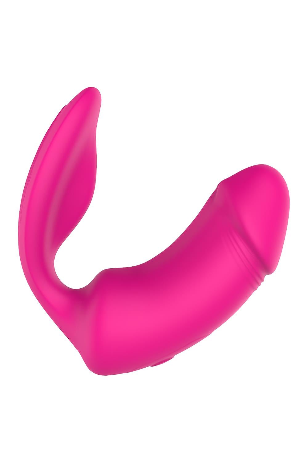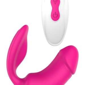 Remote Duo Pleaser firmy Vibes of Love to podwójny stymulator w kształcie penisa do zabawy w pochwie i dołączony stymulator łechtaczki z odpowiednimi zakrzywieniami, aby dotykać łechtaczki i przenosić wibracje.