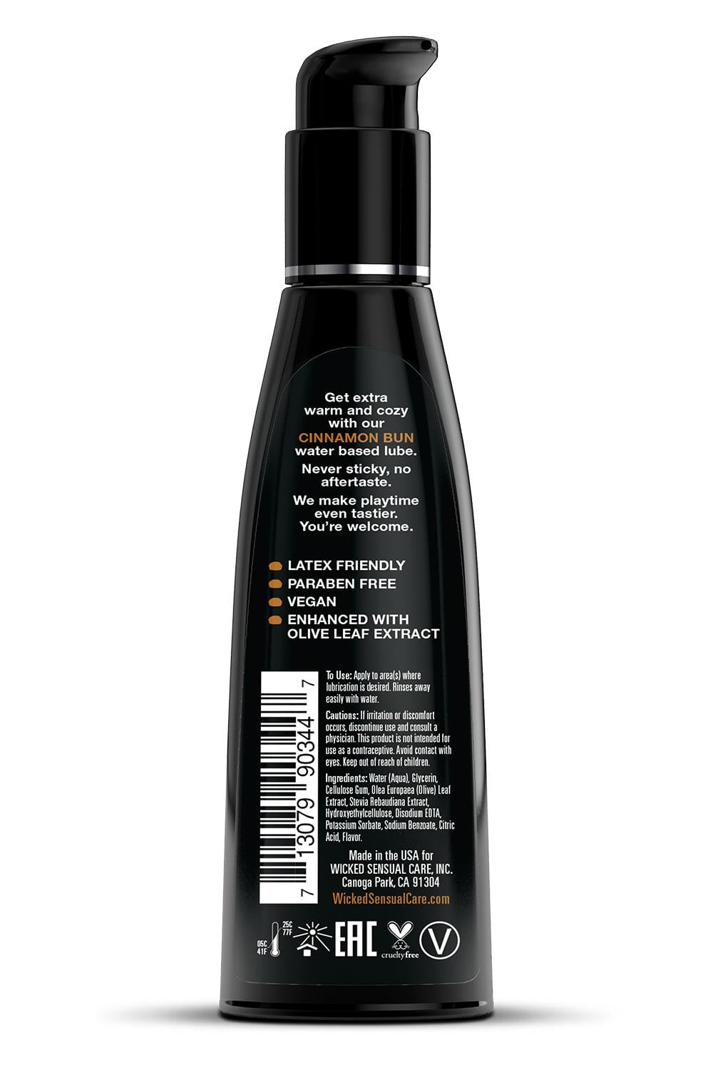 So delicious you’d think it’s the real thing! Wicked Aqua Cinnamon Bun personal lubricant adds subtle and delicious natural flavours to enhance oral pleasures. Light and silky, this water-based formula is the perfect sensual combination of an elegant lubricant and a flavour sensation. Never sticky and without an aftertaste, Wicked Aqua Cinnamon Bun satisfies your sweet tooth and your intimate desires all in one amazing pleasure product. Oral sex never tasted so good. Whether you are giving or receiving, Wicked flavours will give you new sexy confidence. Wicked flavoured lubes are sweetened with Stevia, making them safe for oral, vaginal and anal play.120 mlLong lastingLatex friendlyParaben-freeNever stickyNo aftertasteEnhanced with Olive Leaf ExtractSweetened with SteviaVegan – no animal by-products or testingUse: Apply to area(s) where lubrication is desired. Cleans away easily with water.Ingredients: Water, Glycerin, Cellulose Gum, Stevia Rebaudiana Extract, Olea Europaea (Olive) Leaf Extract, Hydroxyethylcellulose, Tetradsodium EDTA, Citric Acid, Sodium Benzoate, Potassium Sorbate, Flavour.