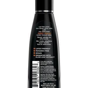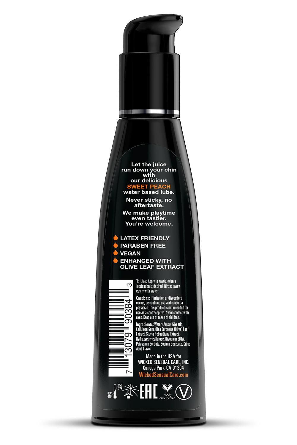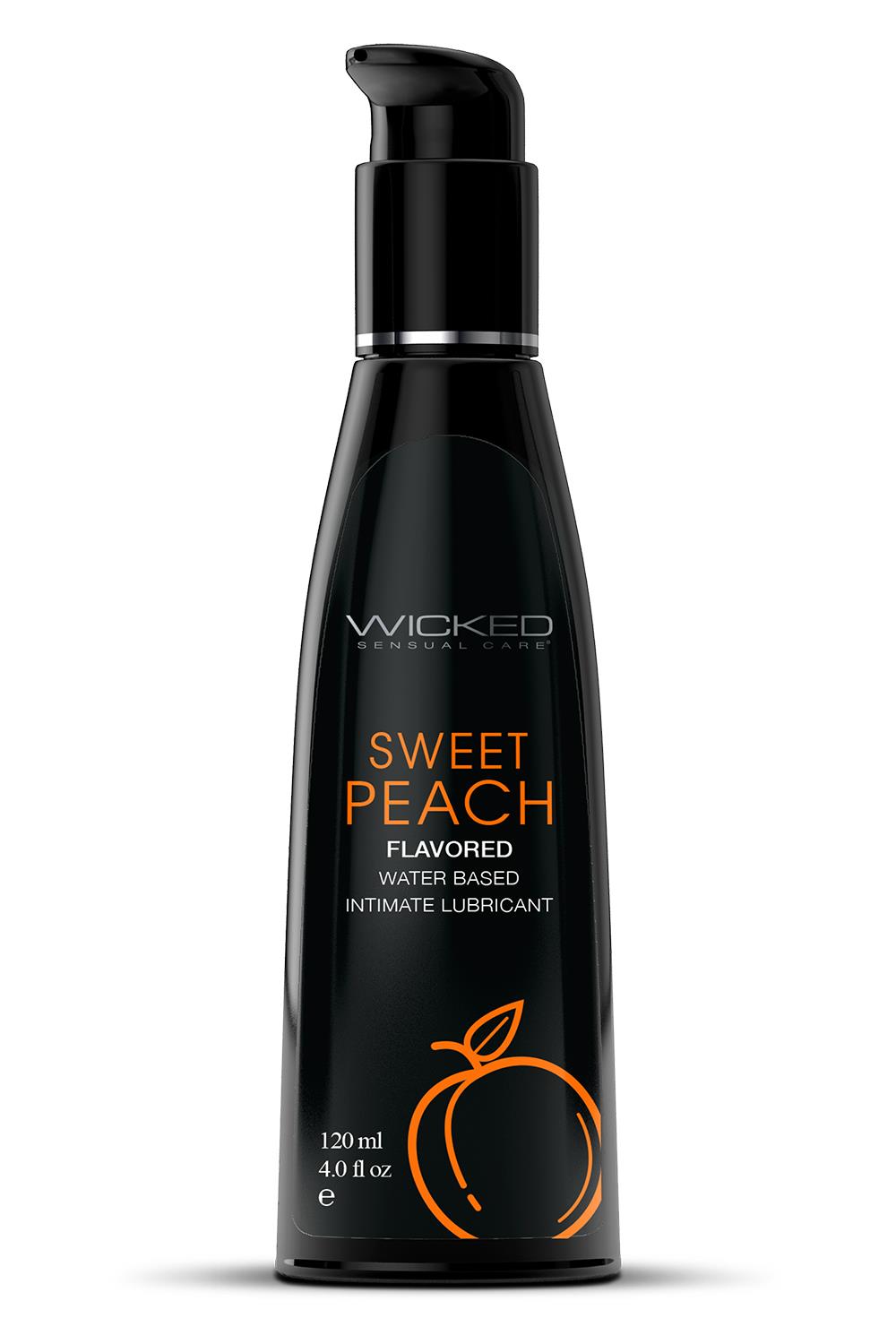 Calling all peach lovers! Kissable, lickable, and delicious, Wicked Aqua Sweet Peach personal lubricant adds subtle and delicious natural flavours to enhance oral pleasures. Light and silky, this water-based formula is the perfect sensual combination of an elegant lubricant and a flavour sensation. Never sticky and without an aftertaste, Wicked Aqua Sweet Peach satisfies your sweet tooth and your intimate desires all in one amazing pleasure product. Oral sex never tasted so good. Whether you are giving or receiving, Wicked flavours will give you a new sexy confidence. Wicked flavoured lubes are sweetened with Stevia, making them safe for oral, vaginal and anal play.120 mlLong lastingLatex friendlyParaben freeNever stickyNo aftertasteEnhanced with Olive Leaf ExtractSweetened with SteviaVegan – no animal by-products or testingUse: Apply to area(s) where lubrication is desired. Cleans away easily with water.Ingredients: Water, Glycerin, Cellulose Gum, Stevia Rebaudiana Extract, Olea Europaea (Olive) Leaf Extract, Hydroxyethylcellulose, Tetradsodium EDTA, Citric Acid, Sodium Benzoate, Potassium Sorbate, Flavour.