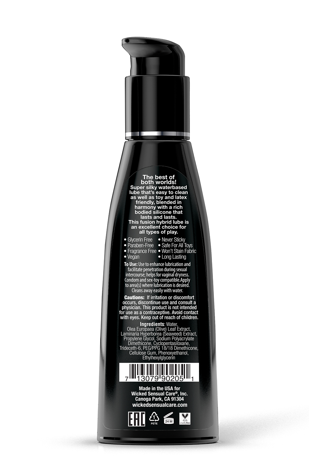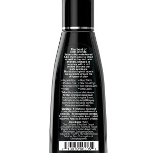 The best of both worlds! Super silky waterbased lube that’s easy to clean as well as toy and latex friendly, blended in harmony with a rich bodied silicone that lasts and lasts. This fusion hybrid lube is an excellent choice for all types of play.Glycerin freeFragrance freeParaben freeNever stickySafe for all toysLong lastingVegan – no animal by-products or testingUse: Apply to area(s) where lubrication and sensation is desired. Rinses away easily with water.Ingredients: Water, Olea Europaea (Olive) Leaf Extract, Laminaria Hyperborea (Seaweed) Extract, Propylene Glycol, Sodium Polyacrylate Dimethicone, Cyclopentasiloxane, Trideceth-6, PEG/PPG 18/18 Dimethicone, Cellulose Gum, Phenoxyethanol, Ethylhexylglycerin.