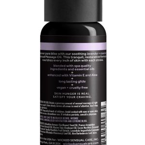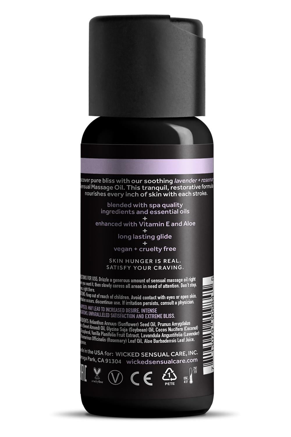 Discover pure bliss with Wicked Sensual Care soothing lavender + rosemary Sensual Massage Oil.This tranquil, restorative formula nourishes every inch of skin with each stroke.blended with spa quality ingredients + essential oils enhanced with Vitamin E and Aloe long lasting glide vegan + cruelty free Skin hunger is real. Satisfy your craving.lavender + rosemary Sensual Massage Oil Ingredients: