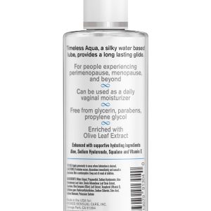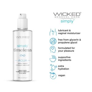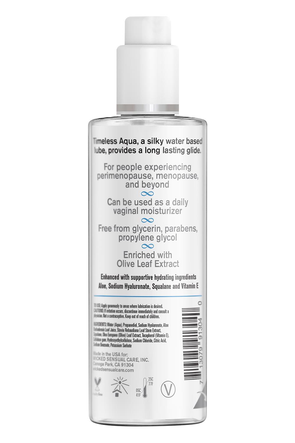 Simply Timeless Aqua is a silky water based lube that provides a smooth, long lasting glide with extra hydration.Menopause and aging can bring about change to our bodies, but our right to prioritize pleasure remains constant. The Timeless collection by Wicked gives people different options based on individual needs and preferences, and each formula has been carefully crafted using the most innovative and rejuvenation ingredients. The Timeless collection is free from glycerin, parabens and propylene glycol. Each formula can be used as a daily vaginal moisturizer.Unique supportive ingredients provide extra moisture and hydration.Featuring expanded labels with enlarged font for easy to read consumer information and support.Vegan and cruelty free.  Supportive ingredients: Aloe leaf juice, Squalane, Vitamin E, Olive leaf extract, Sodium hyaluronate.Jessica Drake, Wicked Sensual Care: „Menopause is a journey experienced by billions, yet shrouded in mystery and misconceptions. It’s more than just a phase; it’s a powerful transition, a natural metamorphosis that heralds a different kind of intimacy and self-exploration. Perimenopause is a phase before menopause that affects many people, often starting much earlier and impacting more lives than commonly realized. We embrace the beauty and the challenges in all stages of life, sharing knowledge that illuminates paths toward comfort, pleasure, and profound self-care in our intimate lives. Remember, you’re not alone; our collective wisdom becomes a lantern, guiding through the uncertainties with warmth and empathy.”Wicked Menopausal Survey of Pleasure in Sign 01-2024Ingredients: Water (Aqua), Propanediol, Sodium Hyaluronate, Aloe Barbadensis Leaf Juice, Stevia Rebaudiana Leaf Stem Extract, Squalane, Olea Europaea (Olive) Leaf Extract, Tocopherol (Vitamin E), Cellulose gum, Hydroxyethylcellulose, Sodium Chloride, Citric Acid, Sodium Benzoate, Potassium Sorbate