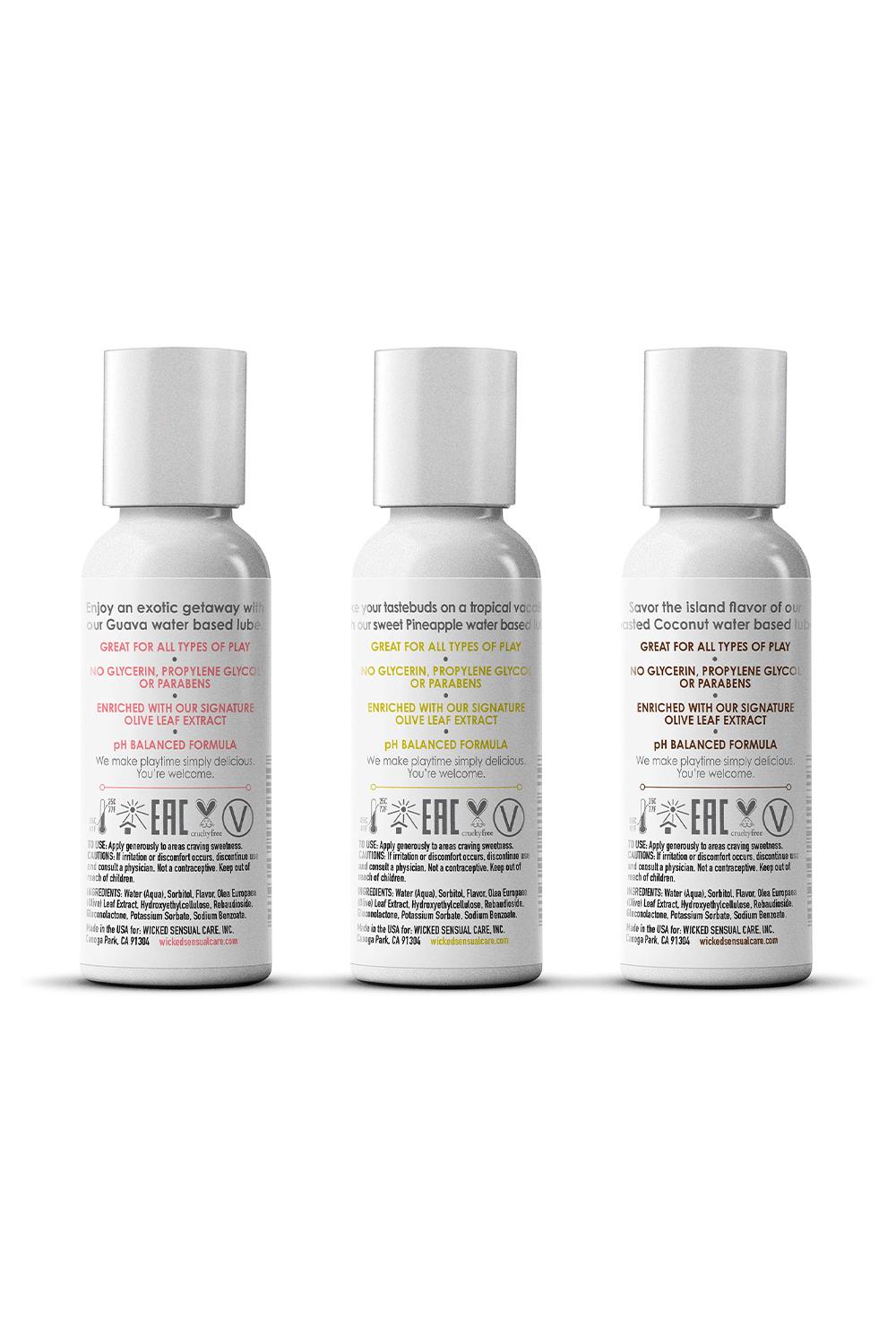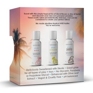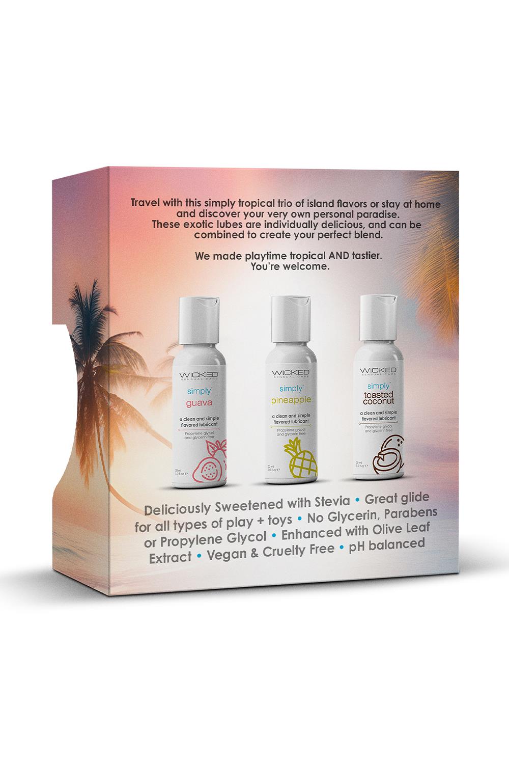 LIMITED EDITION – simply Tropical Trio travel sized flavoured lubes, waterbased.Experience tropical bliss with the simply® Tropical Trio by Wicked Sensual Care. This travel-sized set includes 3 delicious water-based lubes in Guava, Pineapple, and Toasted Coconut flavors. Perfect for all types of play and toys. These brand new simply® tropical flavors are available exclusively in this kit and only for a limited time. Sweetened with Stevia, no glycerin, parabens, or Propylene GlycolVegan & Cruelty FreepH Balanced3 x 1 fl oz / 30 mlWaterbasedFlavours: Guava, Pineapple, Toasted CoconutPropylene glycol and glycerin freeWith olive leaf extractVeganCruelty freeSweetened with SteviaNo glycerinNo parabensNo Propylene GlycolpH balancedWe made playtime tropical AND tastier. You’re welcome – Wicked Sensual Care