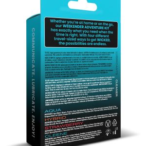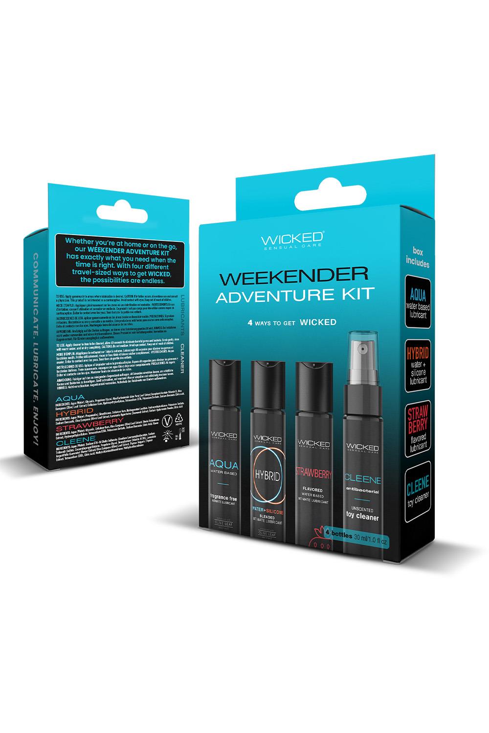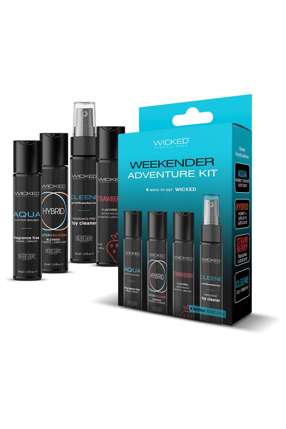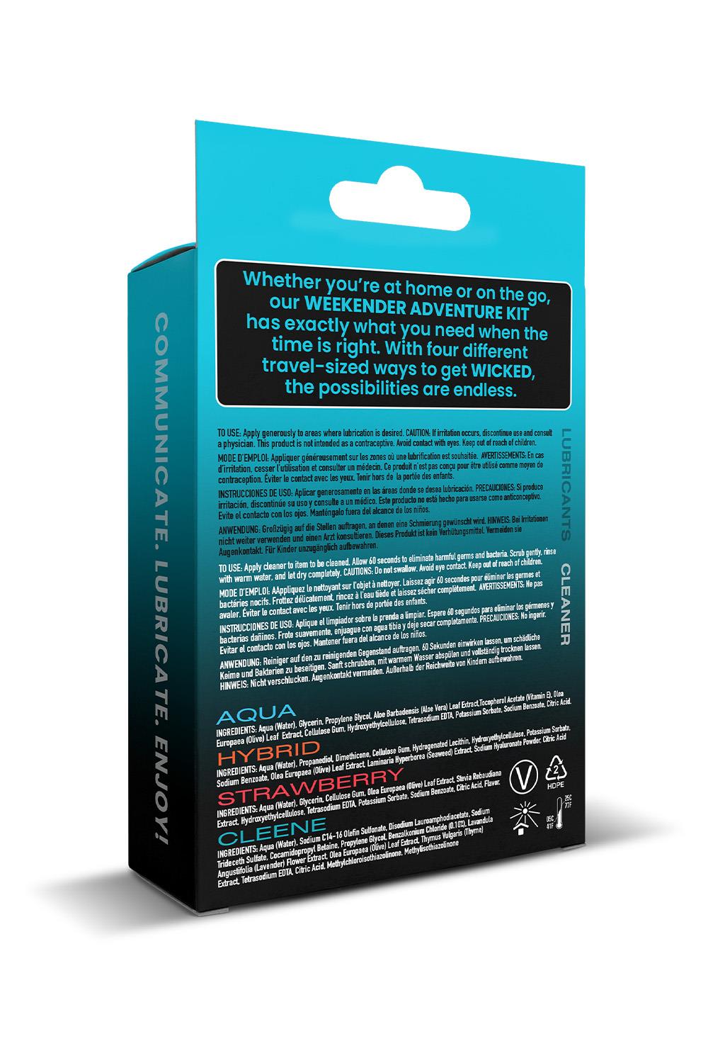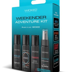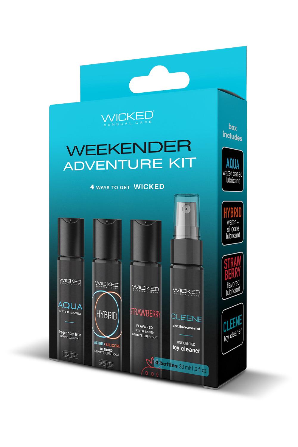 Whether you’re at home or on the go, the Wicked Weekender Kit has exactly what you need when the time is right. With 4 different travel-sized ways to get WICKED, the possibilities are endless. Wicked Weekender KitAqua Water-based intimate lubricant 30 mlHybrid Water and Silicone blended intimate lubricant 30 mlStrawberry flavoured water-based intimate lubricant 30 mlCleene antibacterial unscented toy cleaner 30 mlUse Lubes:Apply generously to areas where lubrication is desired. Caution: If irritation occurs, discontinue use and consutl a physician. This product is not inteded as a contraceptive. Avoid contact with eyes. Keep out of reach of children.Use Cleene: Apply cleaner to item to be cleaned. Allow 60 seconds to eliminate harmful germs and bacteria. Scrub gently, rinse with warm water and let dry completely. Cautions: Do not swallow. Avoid eye contact. Keep out of reach of children.
